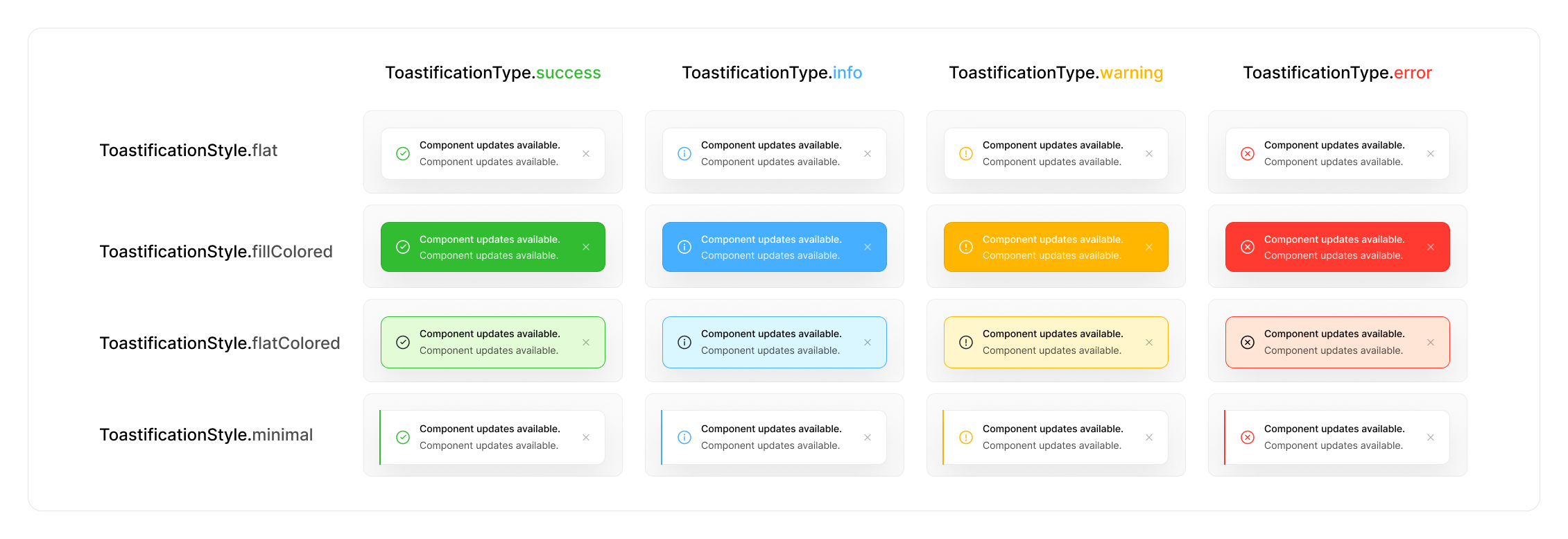 toastType (String): Type of notification, which determines its color and icon. Options are: