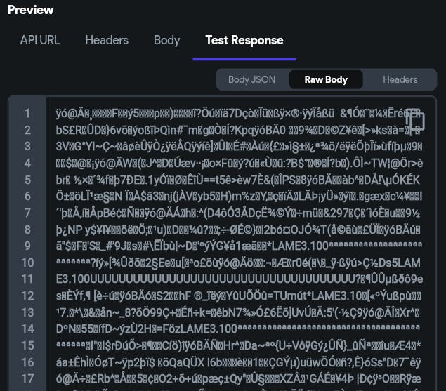I think everyone trying to integrate the ElevenLabs API encounters the same issue: it returns a "200 success" code but with "null" content, and when you look at the "Raw Text" part, you encounter strange encoding.