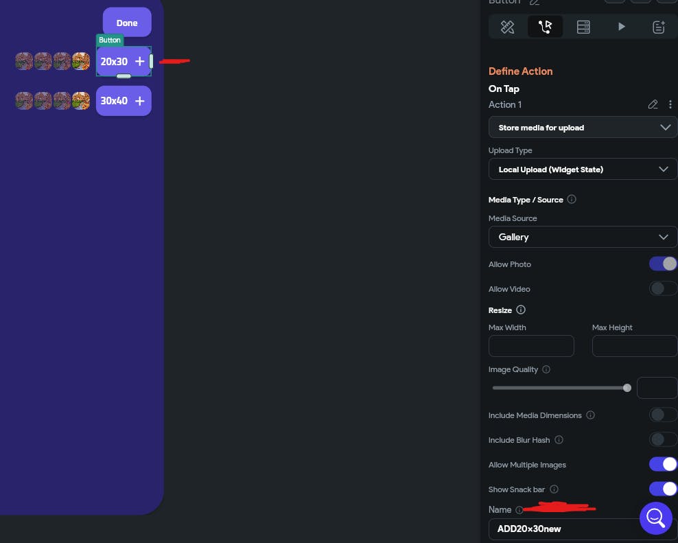 next : the (Done button) is where you would upload your images to firebase(via custom action ) userid and Uploaded list