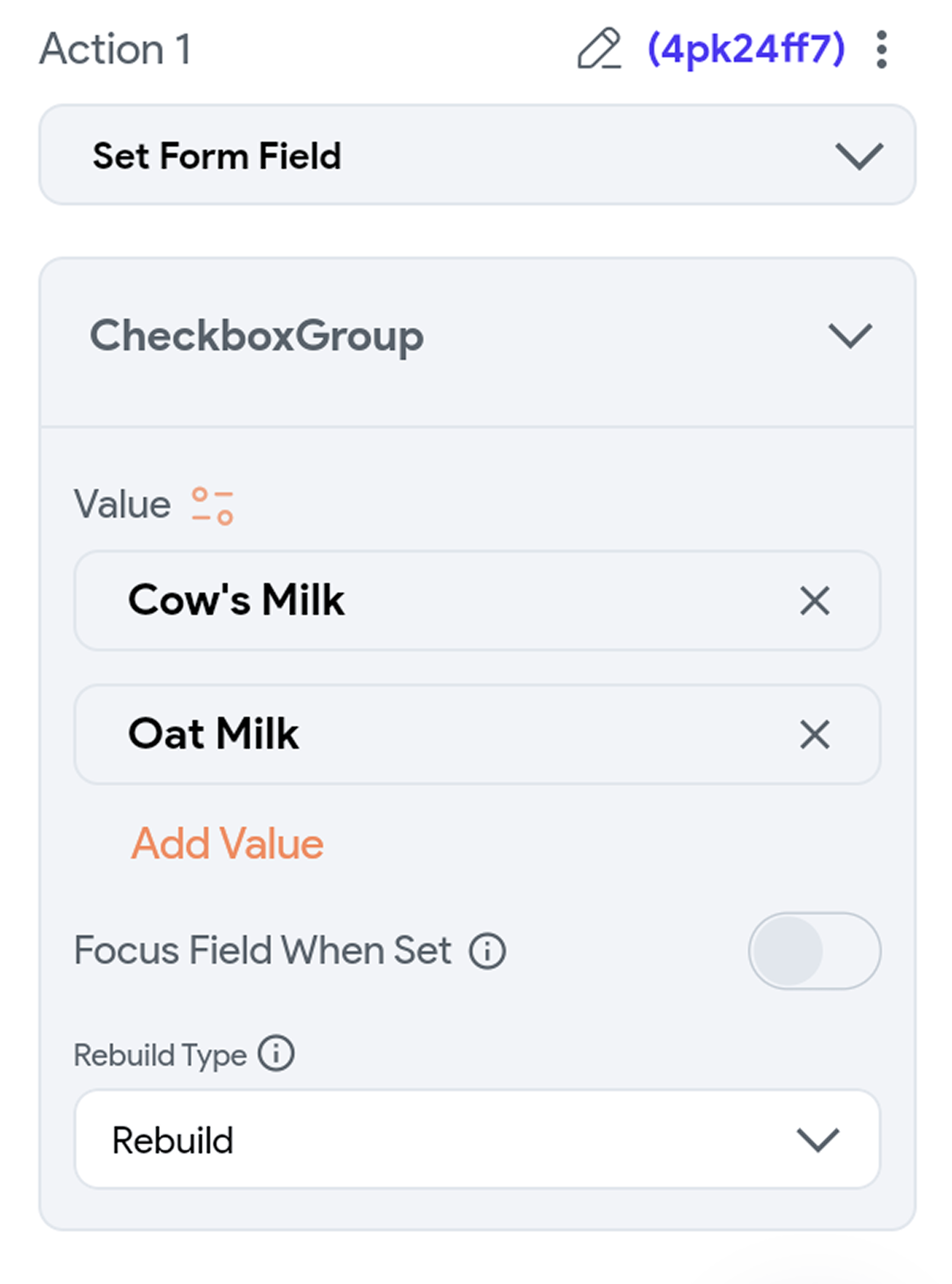 New Option: Set/Reset Form Field actions now include a Rebuild Type setting, giving you control over when the UI rebuilds.