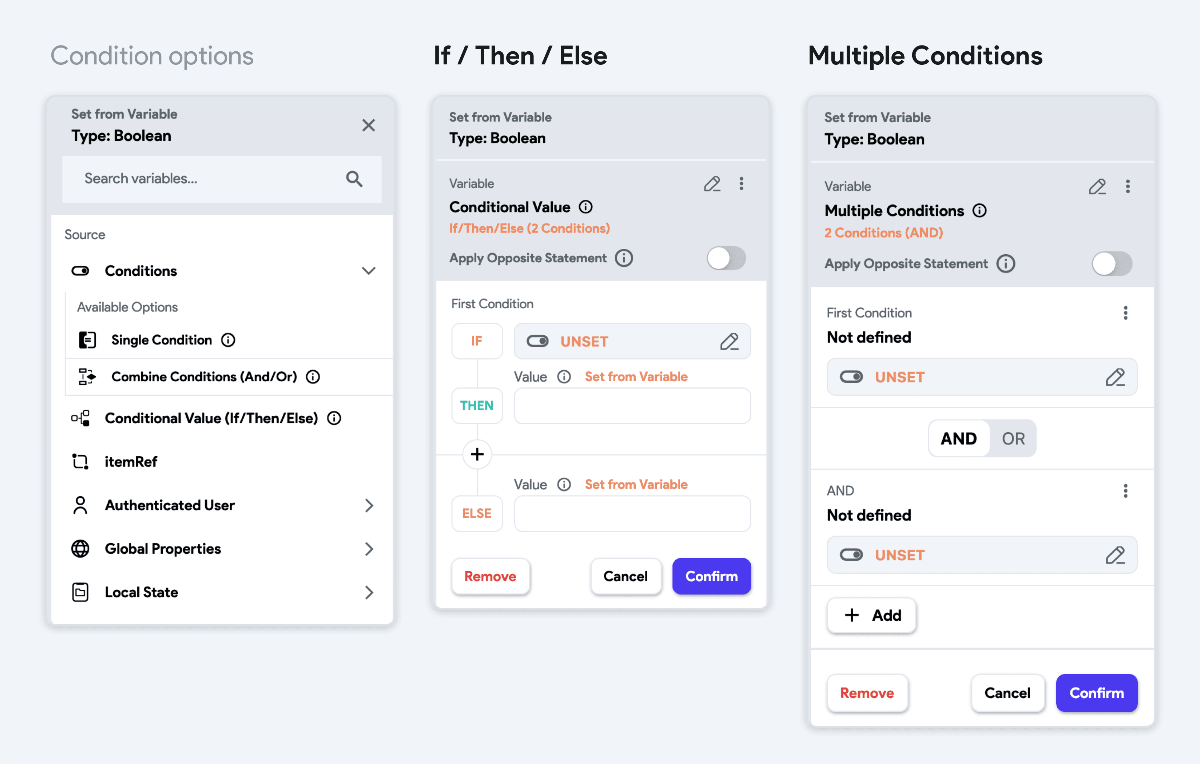 Conditional Values using if + then/else. Example: IF userRole = Admin, THEN Custom Function A, ELSE Custom Function B