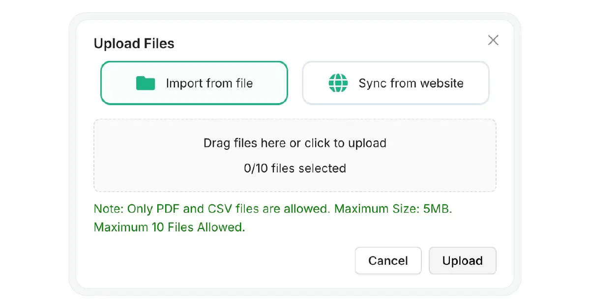 Upload your Knowledge base file (data about your product/ service) in PDF, CSV or TXT format.