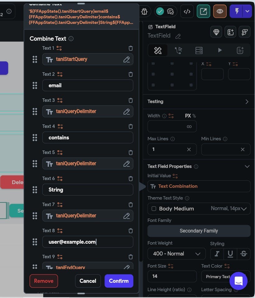 Ahhh yes, so just like any database. Storing data is more than just saving it. You must be able to retrieve it consistently. Also because TANI stores your data in a JSON tree you must have a way of building the JSON object when you want to save new data (uno "create new row"). Flutterflow for a long time did NOT contain any features for creating JSON (and now that it does, it's only via the static custom Data Types, it means you'd have to create a data type for EACH table you make, YUCK! 🤮). Tani Query steps in, it's a VERY SIMPLE MARKDOWN/SYNTAX! So with 'Tani Q' you can construct your JSON object in plain English using the Flutterflow Text combination feature and then you pass it to the Tani string parser which converts the string into a JSON object ready for you to use in your 'queryRows' action or your 'create new row' action! Cool right?? Let me give you an example, if you write this in no-code: