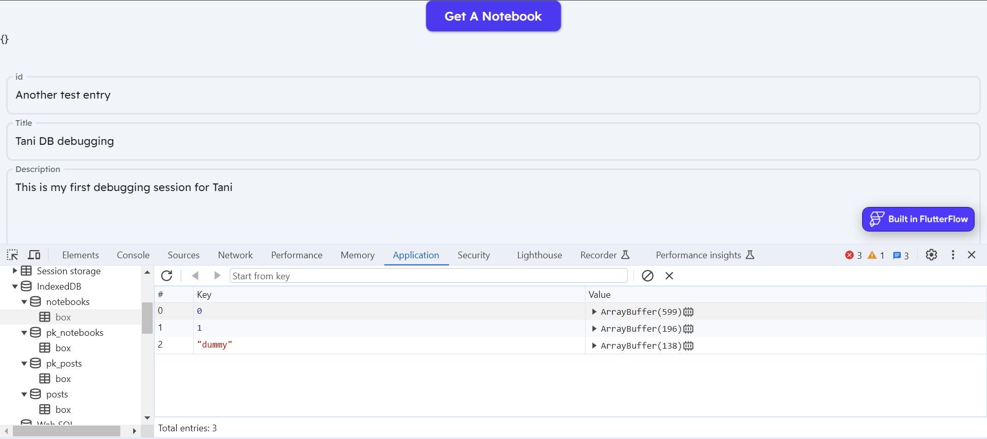 Thanks for asking 😊! TANI is a No-Code Database Management Extension inside Flutterflow for the Flutter HiveDB. Essentially, Tani helps you to manage instances of Hive DB via a collection of Actions, Functions and Variables (14 Actions, 5 Functions, 9 App state variables, 3 Page state variables & 1 Custom Data Type, all pre-installed). So, when you create a 'table' in Flutterflow with Tani, you're actually creating a Hive Box under the hood. Think of it as how Supabase is basically PostgreSQL but without the hassle! Same. TANI is Hive but without a lot of its limitations or any CODE 😁. If you wanna know exactly how data is stored by Tani in Hive think of Firebase Real-time database. Both FB Realtime and Tani store your data in almost the same way (a big tree of key-json pairs). So you can see most to the advantages like blazingly fast speeds 🚀 and shallow queries all accrue (as do the limitations too though 🧐 nested AND/OR queries anyone???). Because Tani is basically Hive DB in a bespoke suit, it works on ALL PLATFORMS - iOS, Android, Linux, Windows, MacOS, Web. No additional setup required. Hive figures out how to store data on each platform (on the web it uses Indexed DB and you can LITERALLY see the Data schema in the browser console check screenshots at end of post, and press F11 on a windows PC when using the test app, although the actual data is raw byte data unintelligible for you to read).