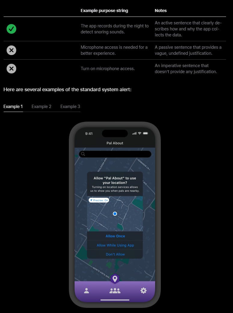 To help users make informed decisions about how their data is used, permission request alerts need to explain and include an example of how your app will use the requested information.