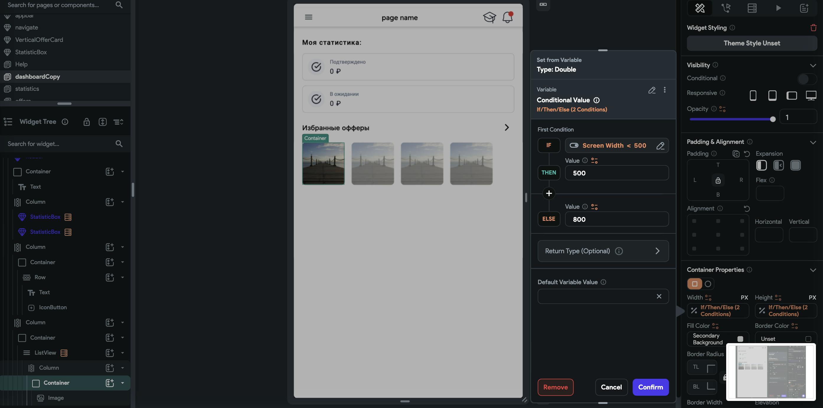 I am trying to set container width and height via conditional output but it doesn't work why?