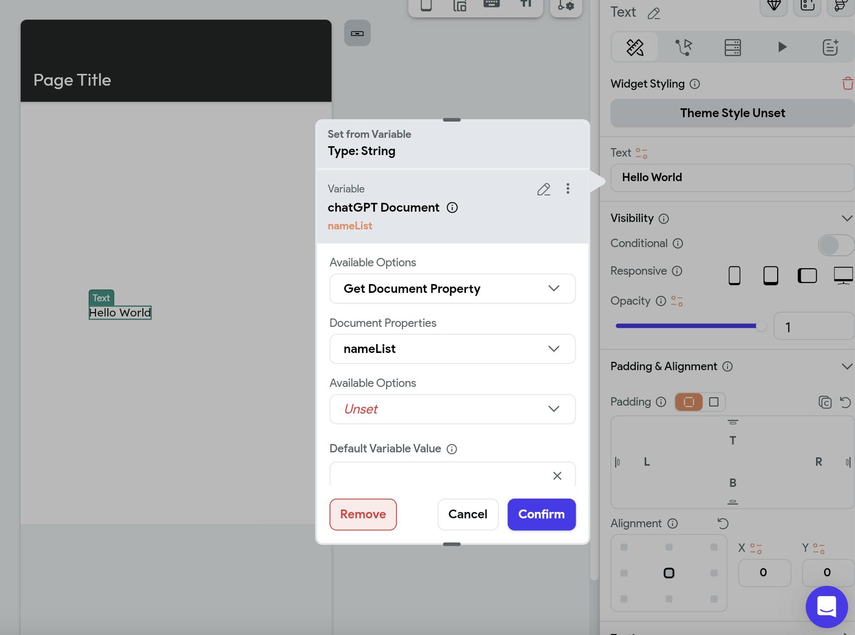 When I then try to bind/set the text filed variable to reference the the right fields ('nameList' I get the following 'list' options and this is where I cannot get past (after I click 'Unset' i get the options shown on the 2nd screenshot):