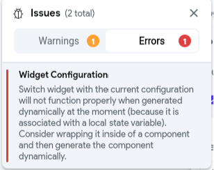 I have added a switch in my list view widget. I am unable to understand this error. Can someone help me to understand what this is please? Appreciate all the help. Thank you very much.