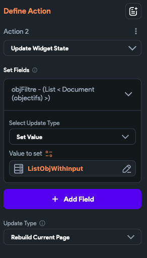 Then, I have a button to filter the data from this list. When the user clic on the button, I'm using the result of a fonction to update the App Page variable with the action "set value". I've selected the "Update Type" : Rebuild Current Page. But when I click on the button in the test mode, nothing change.