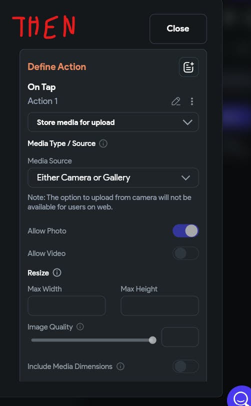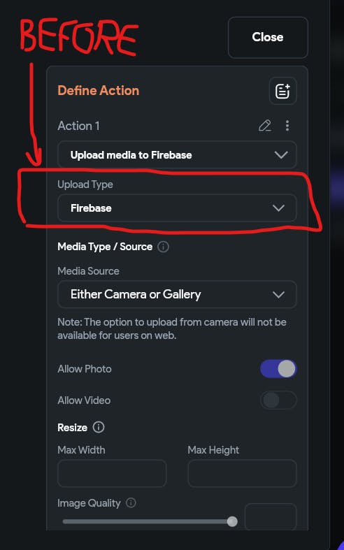 in 2022 project, i setup uploading image using (upload type option) which allows me to store the image locally then in action panel i can upload it to Firebase.