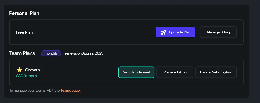 I recently migrated to a new payment plan. Instead of $70, I’m now paying $80 in order to access features like code export. However, after the upgrade, my account shows Personal Plan as Free Plan and Team Plan as Growth. Because of this, I can’t export code or use the tools I should have access to — it’s behaving as if I’m still on the free plan.
